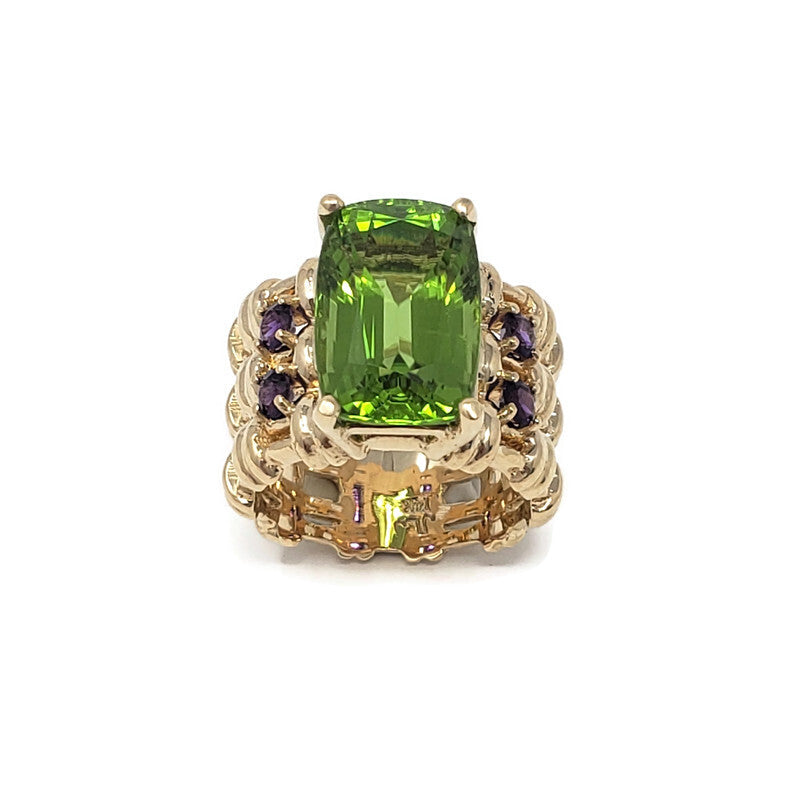 A large 15mm x 10mm gorgeous and rare Arizona peridot emerald cut gemstone with purple amethyst accent stones.
