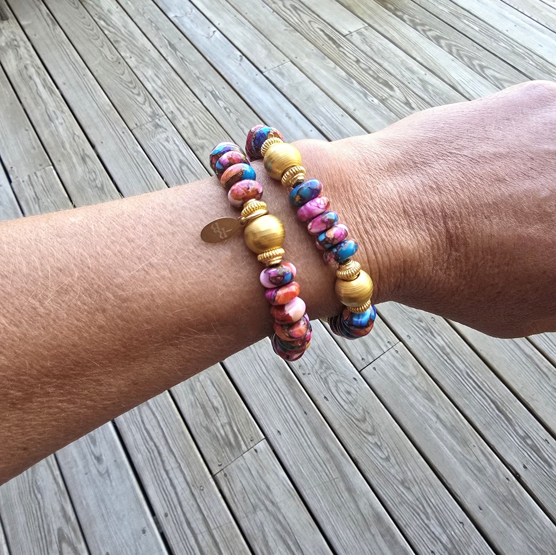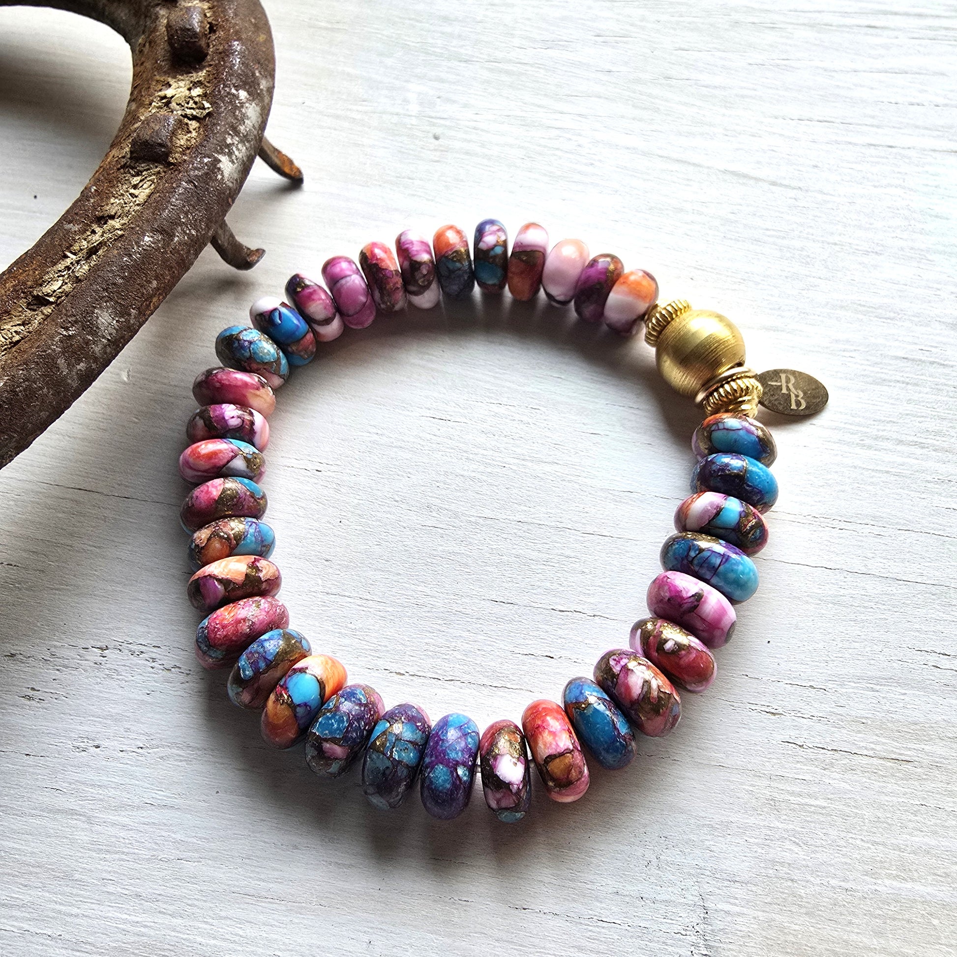 Make a bold statement with our orange dahlia beaded stretch bracelet. We named this one Beth Ann. Kingman turquoise compressed with colorful shells.