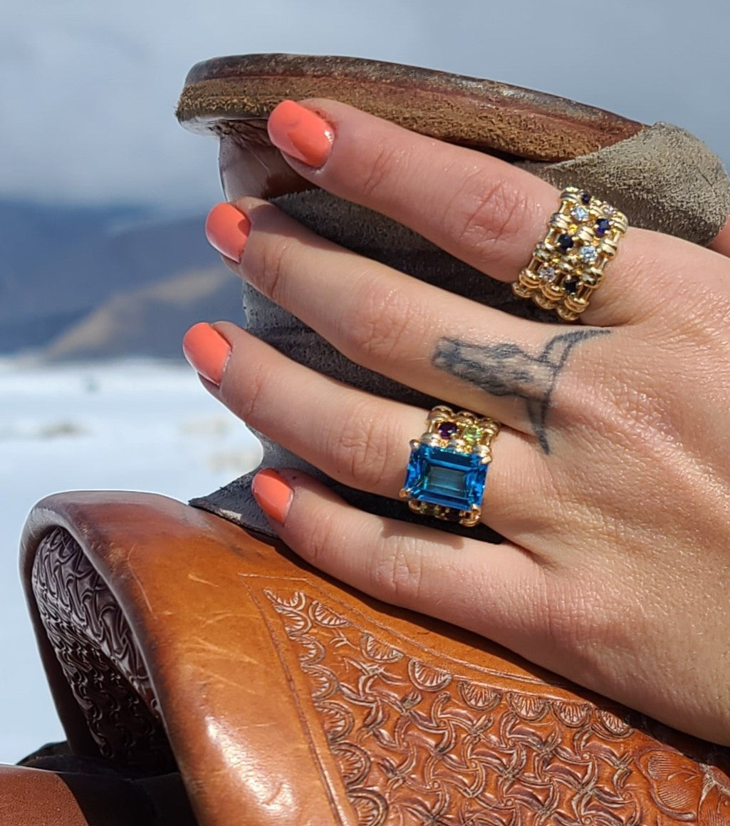 A large 15mm x 10mm gorgeous blue topaz emerald cut gemstone with amethyst and peridot accent stones.