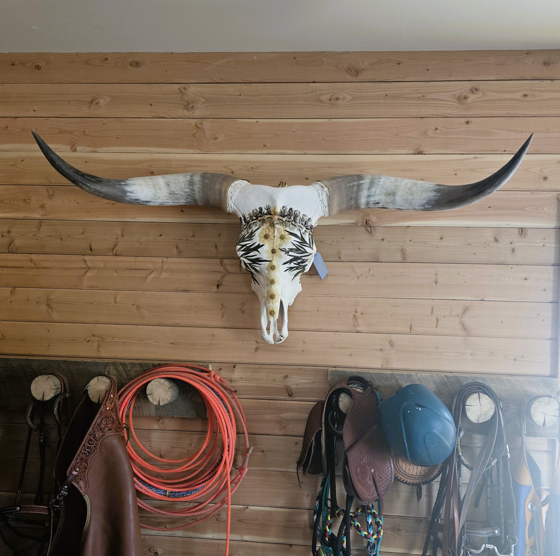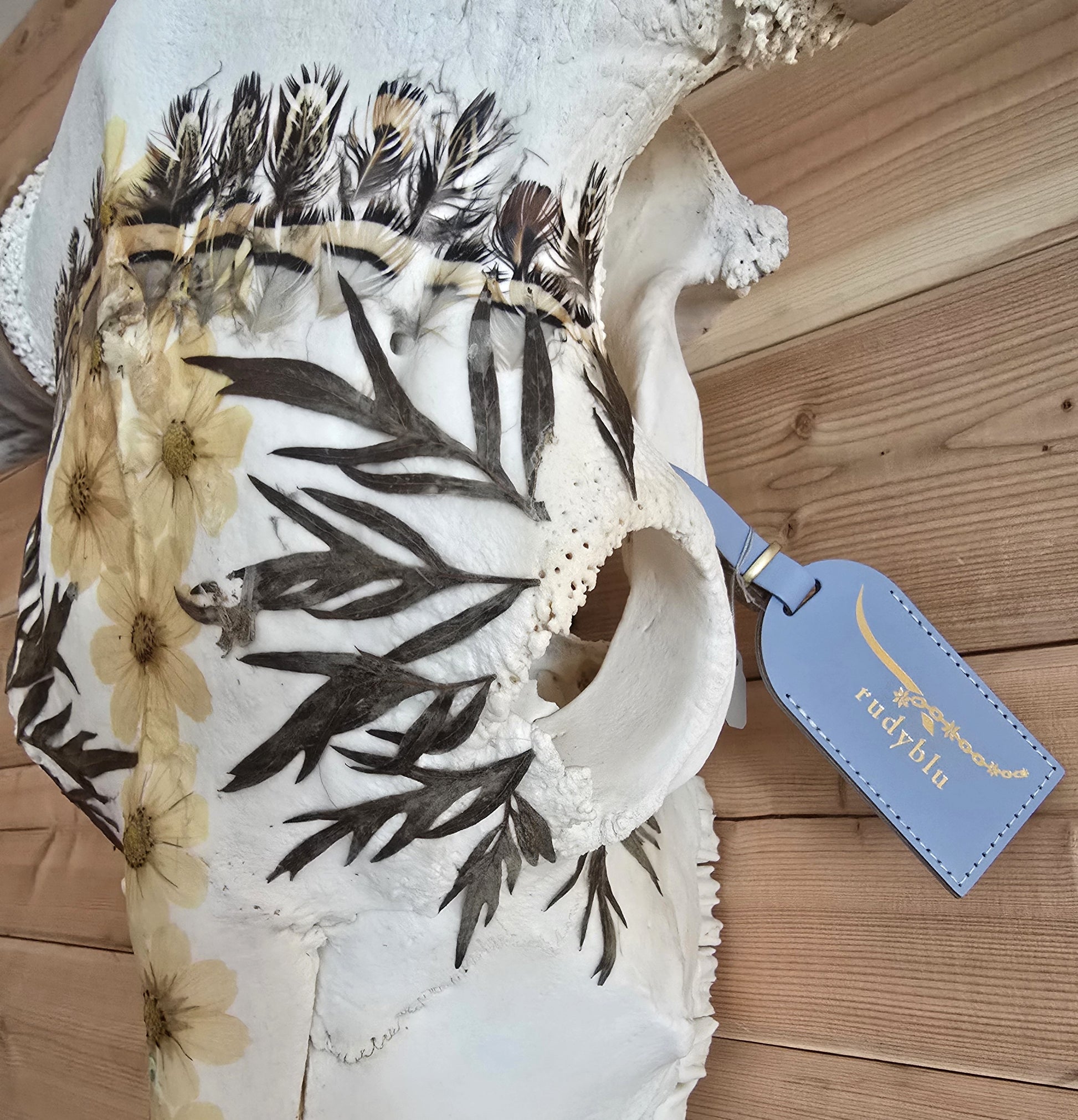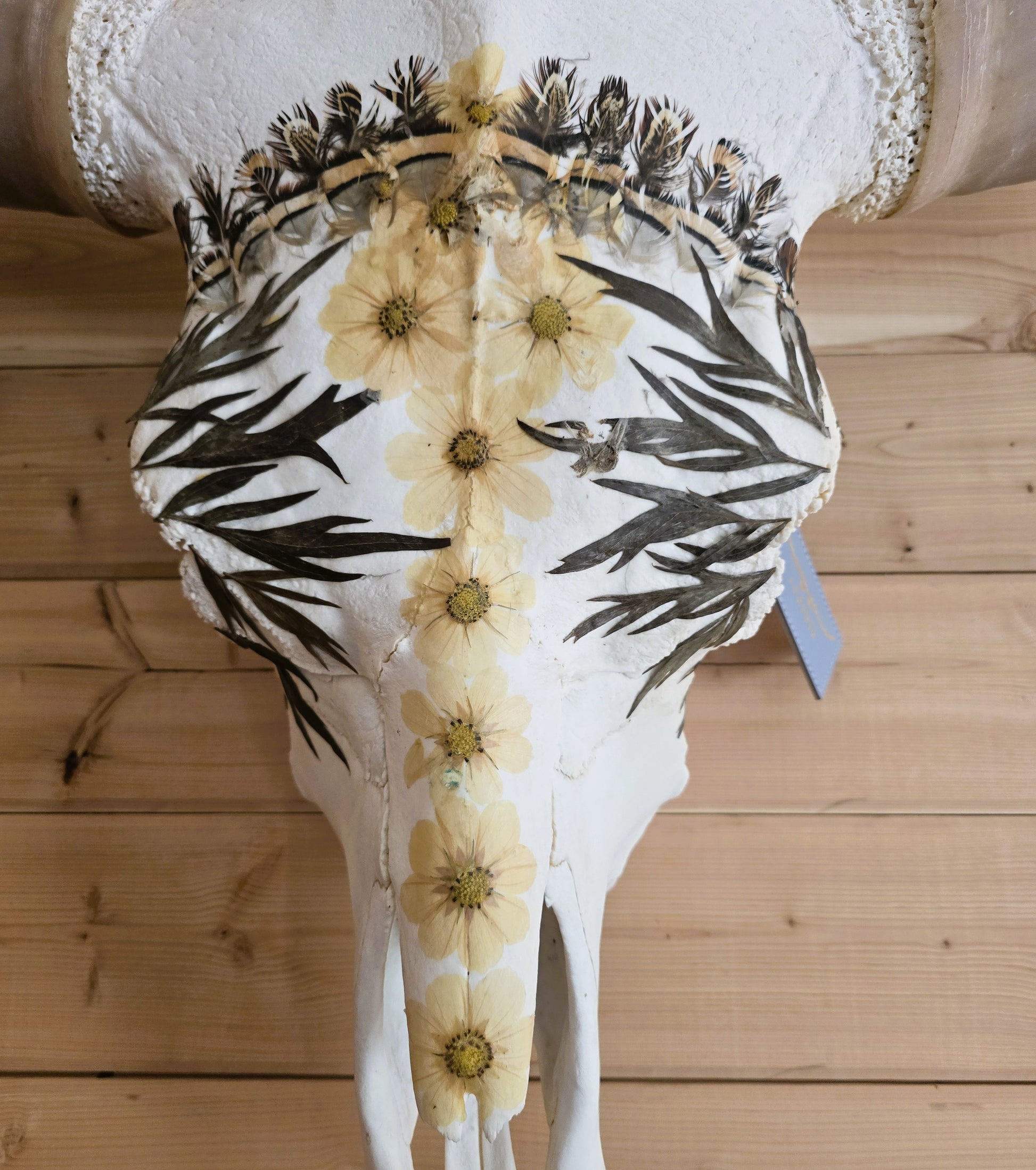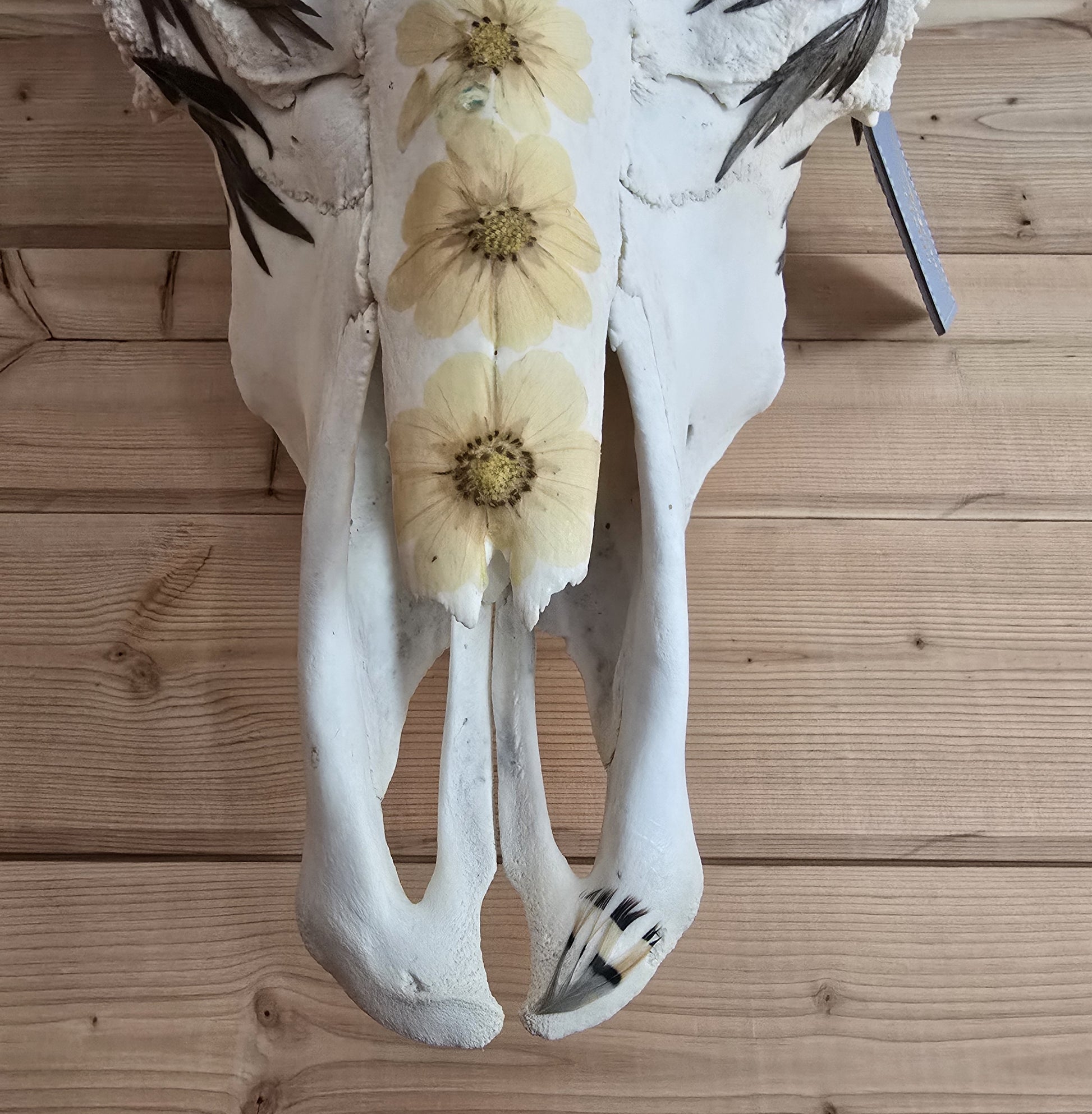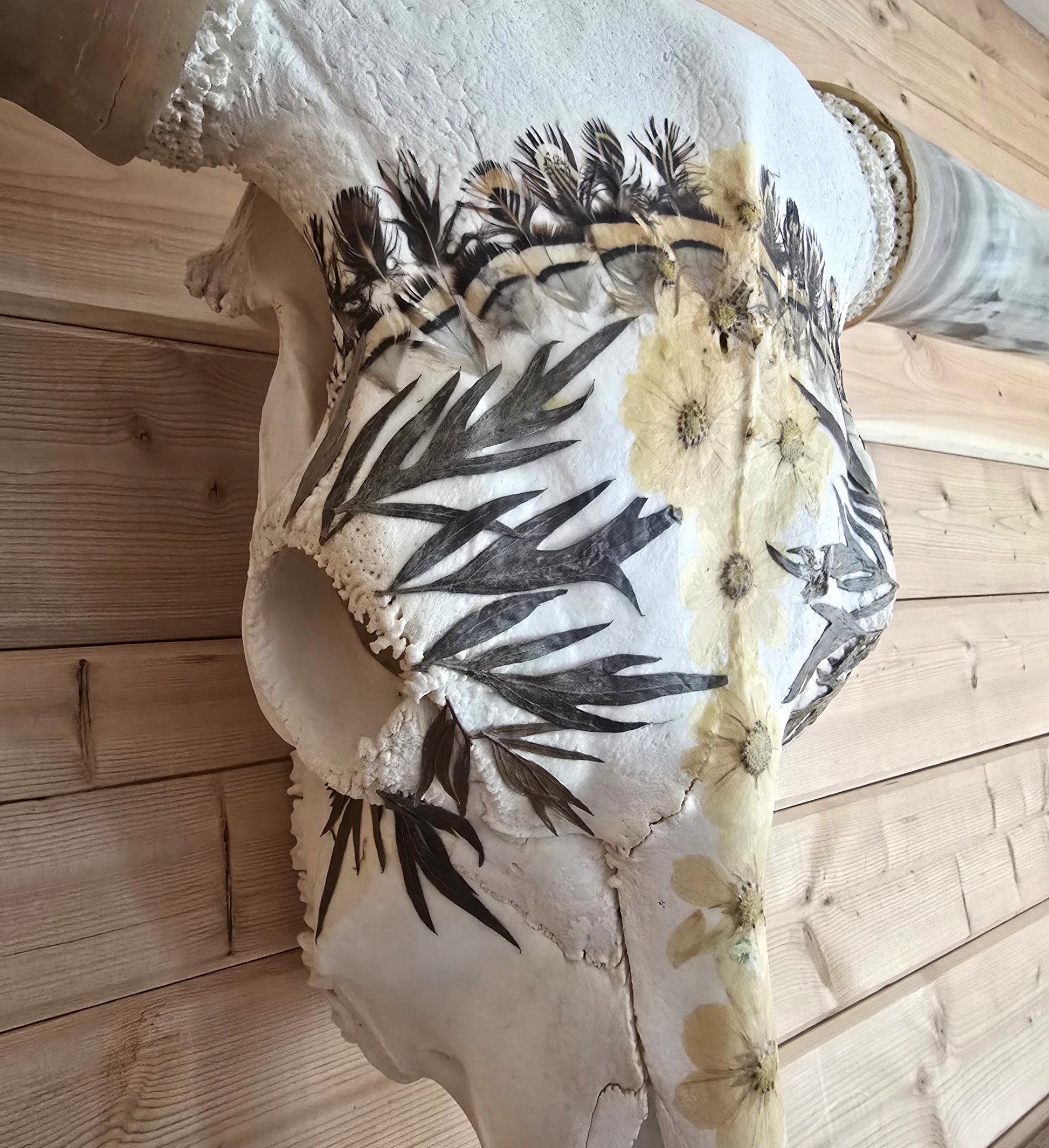 This Texas longhorn skull is covered with real flowers, leaves and Chukar feathers that I hunted myself. Bring a touch of nature and whimsy to your home with this unique piece.