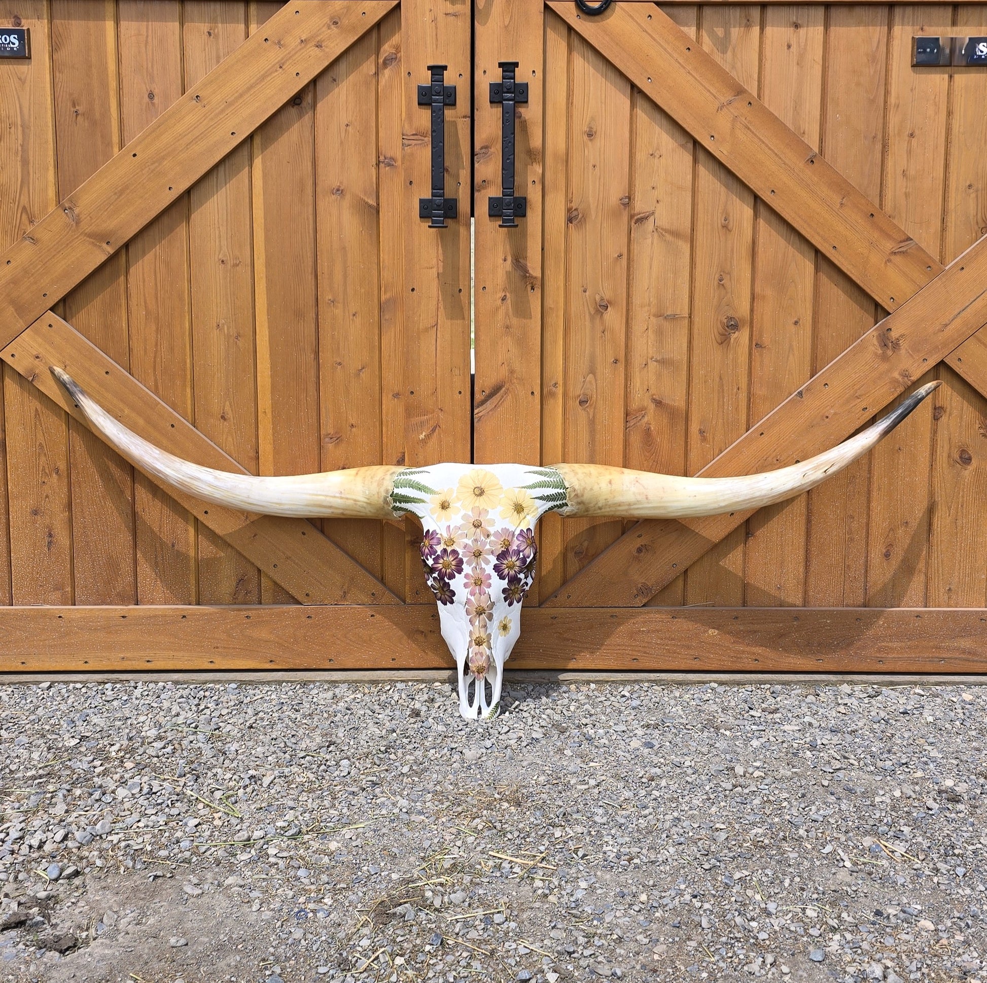 This Texas longhorn skull is covered with real flowers and leaves in beautiful shades of purple and cream. Bring a touch of nature and whimsy to your home with this unique piece.