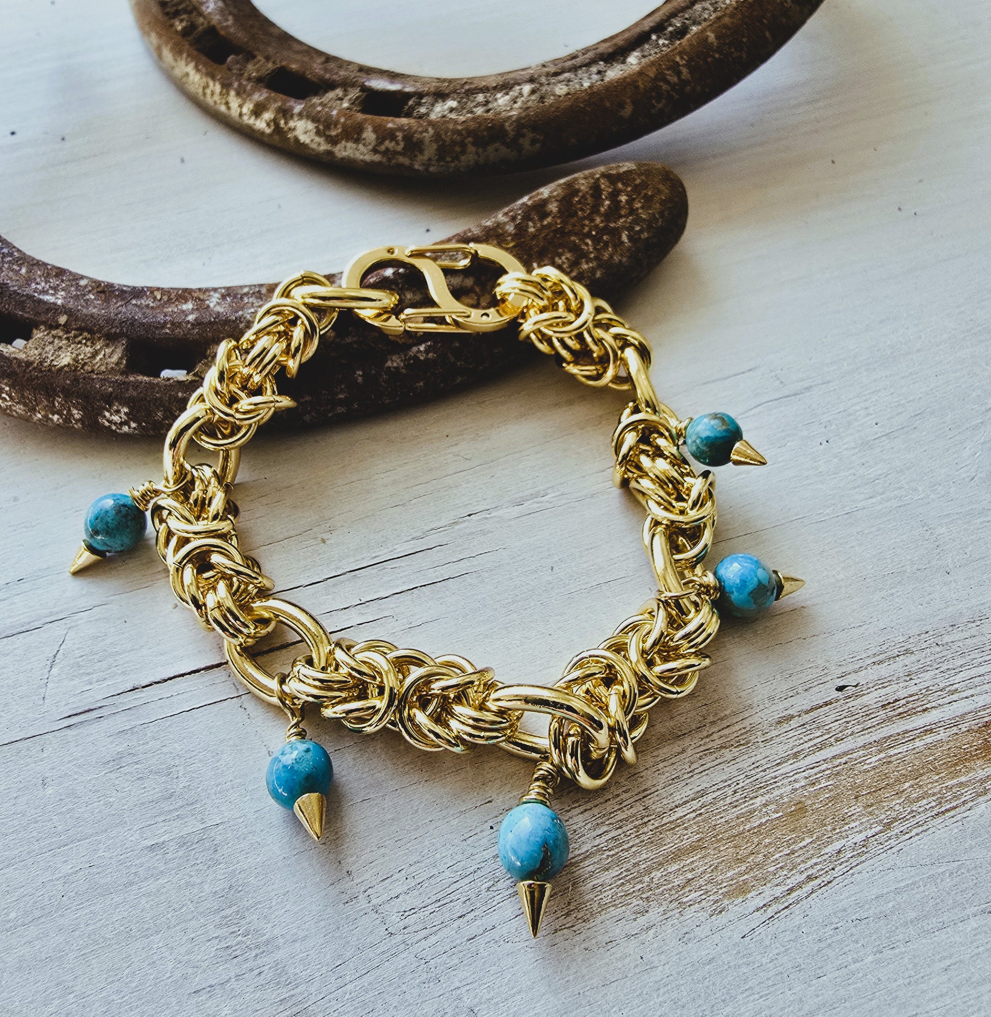 Add some country charm to your wardrobe with our Gold Chain Bracelet. The gold maille chain perfectly complements the colorful turquoise charms, creating a playful and stylish accessory.