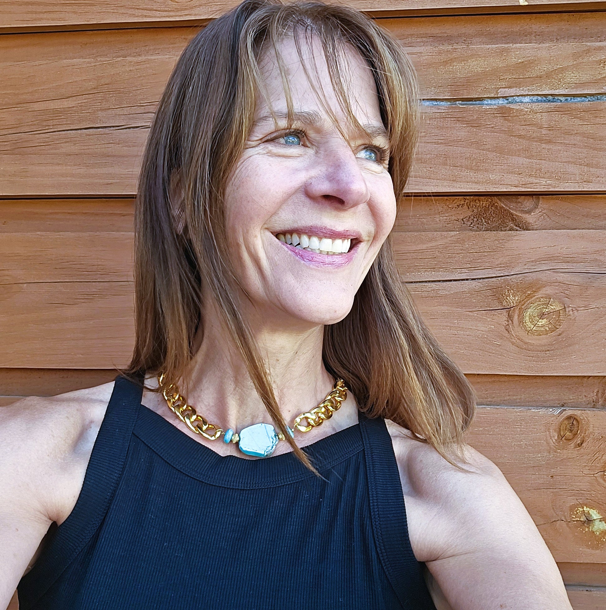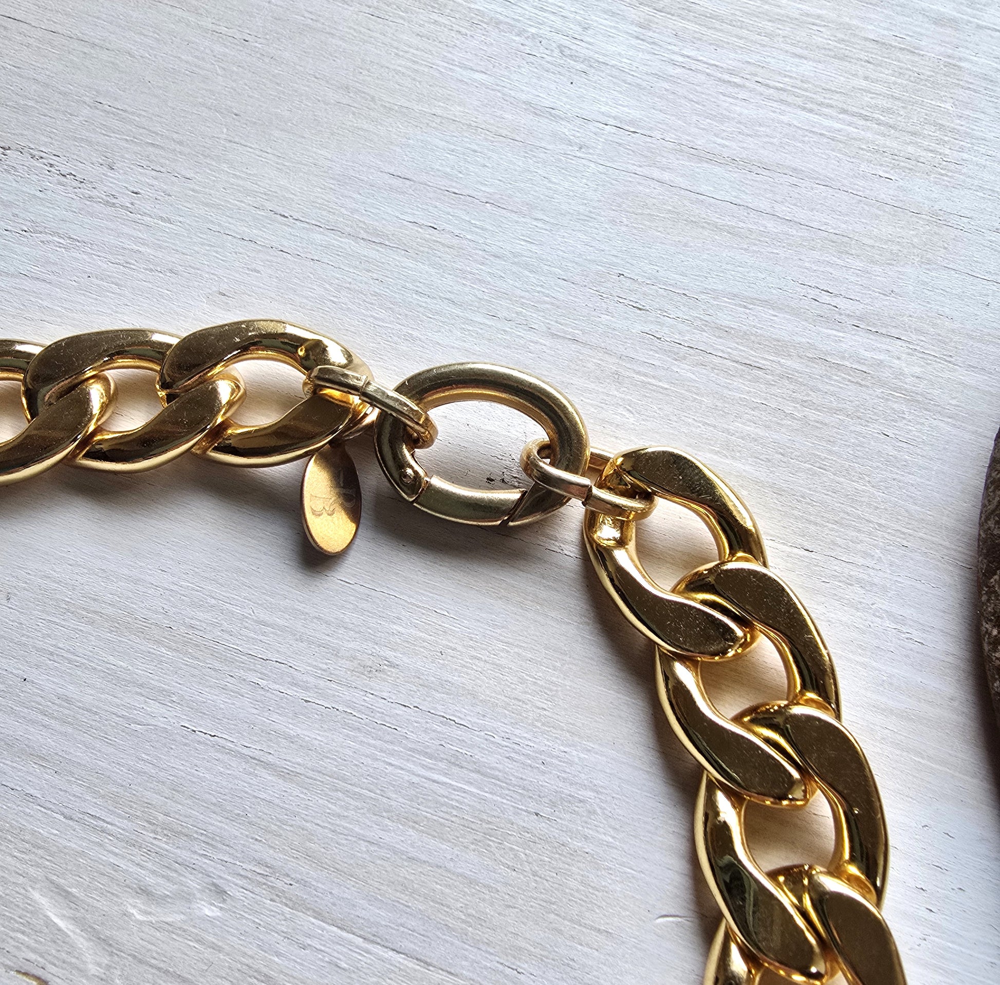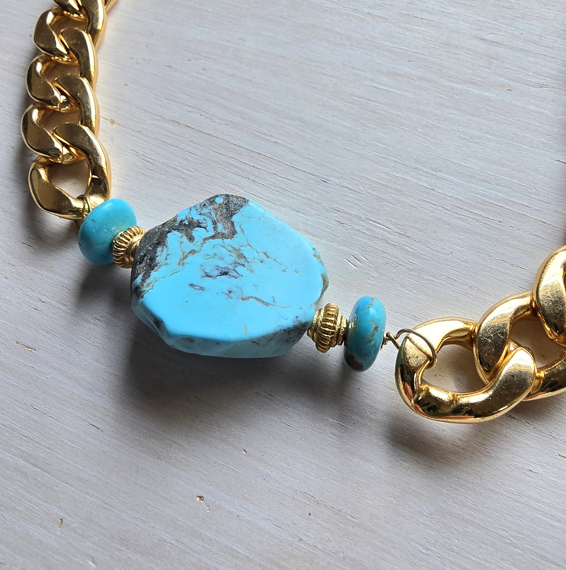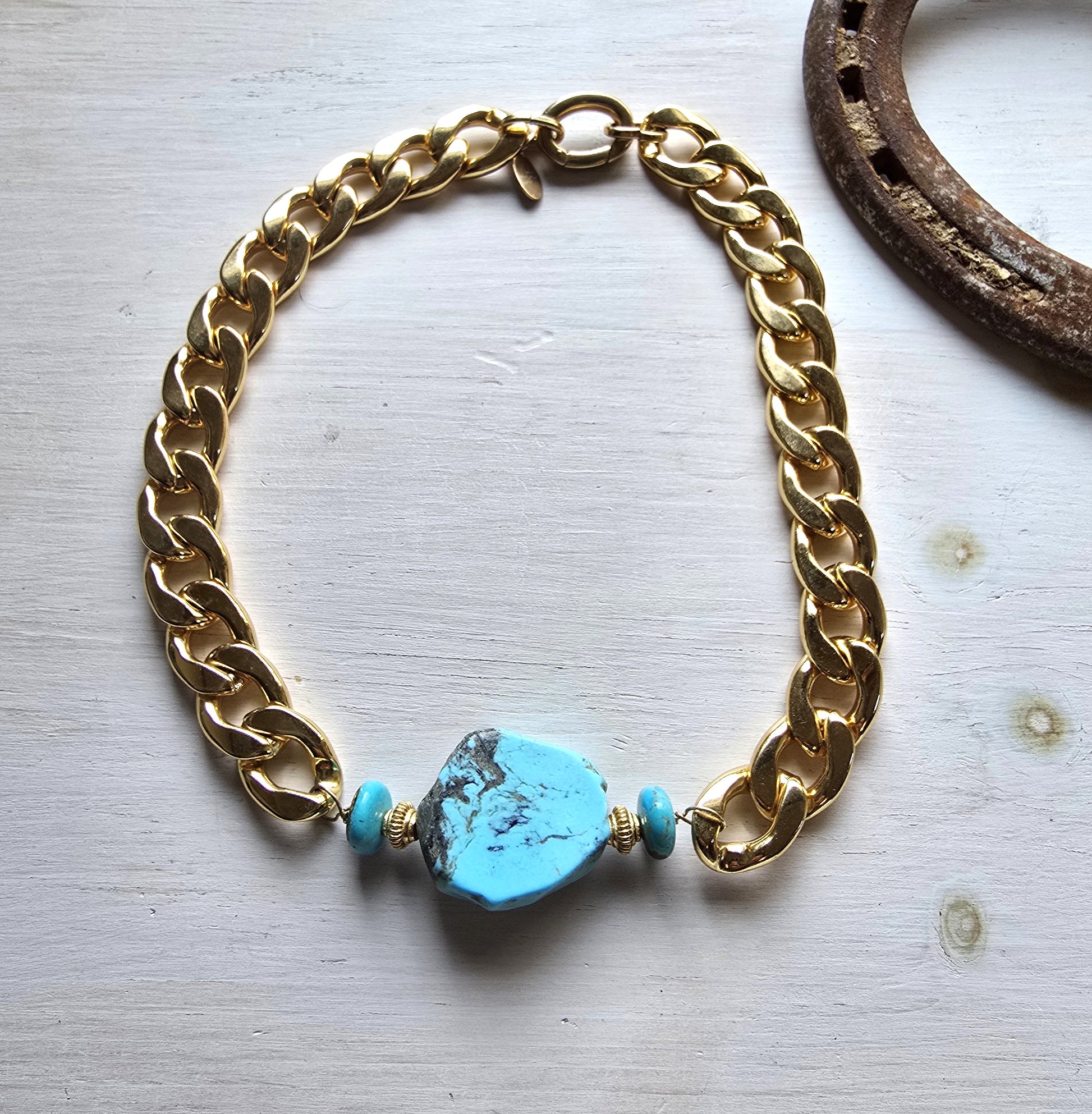 Make a statement with our slab collar necklace. Kingman turquoise slab with 18k gold plated stainless steel curb chain.