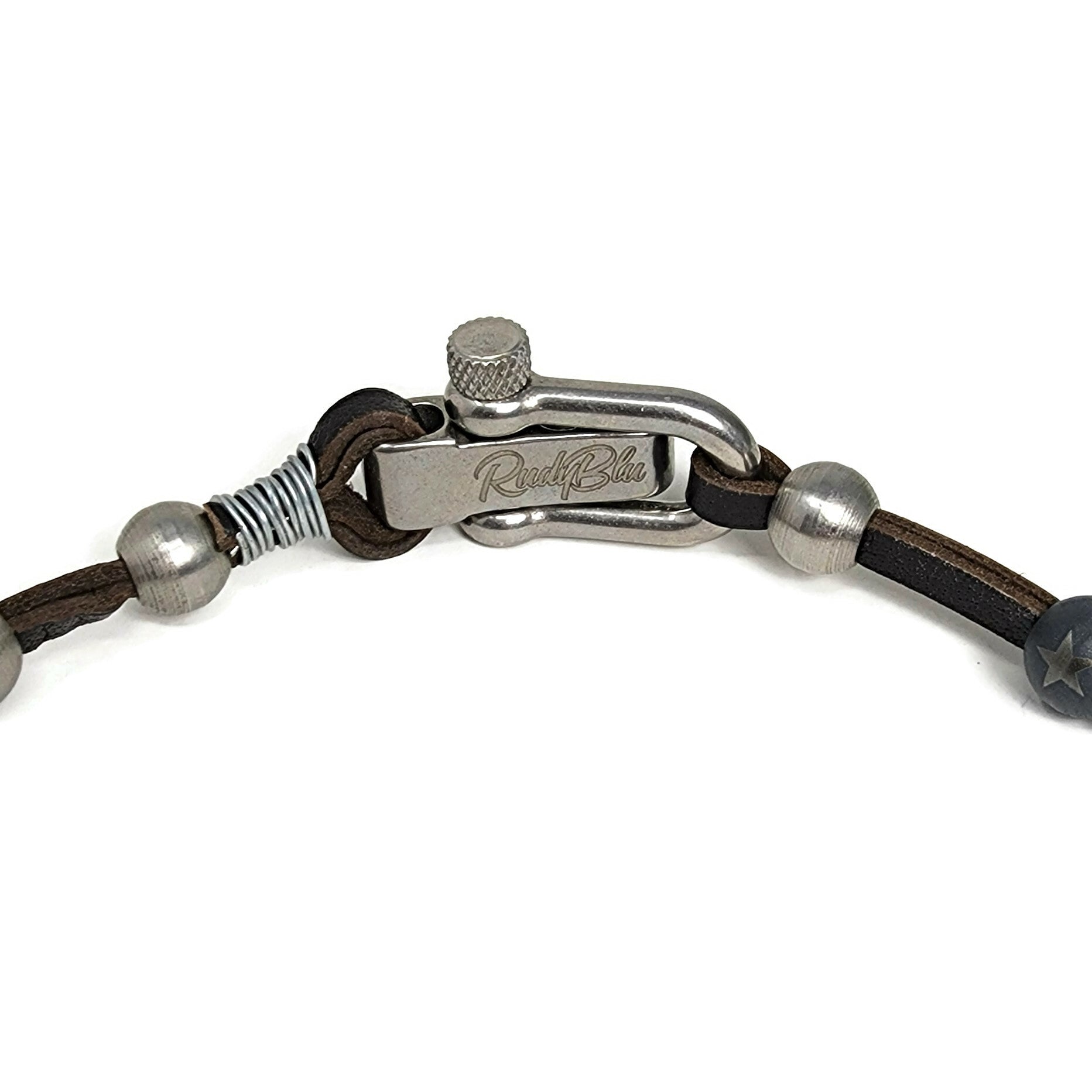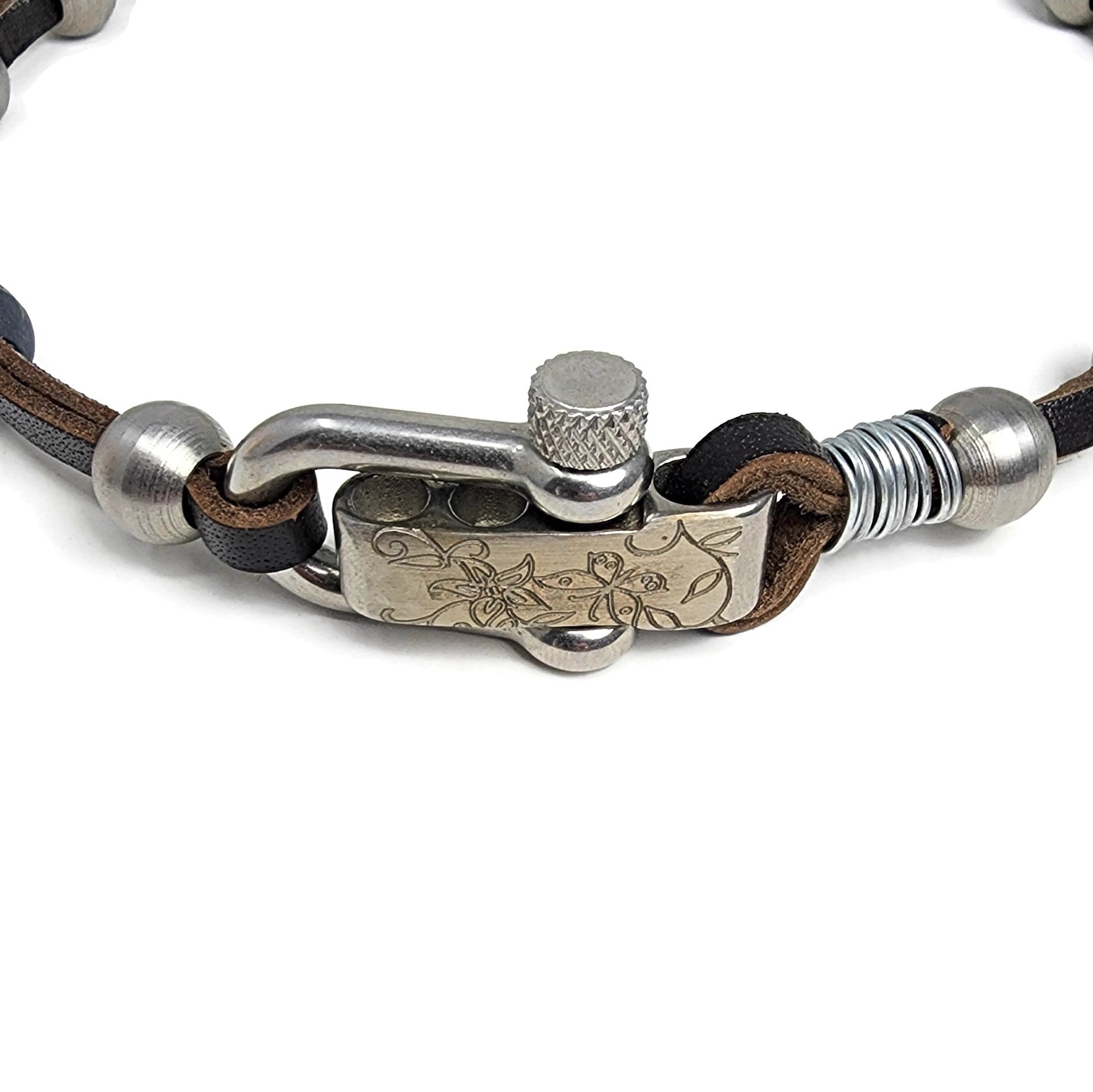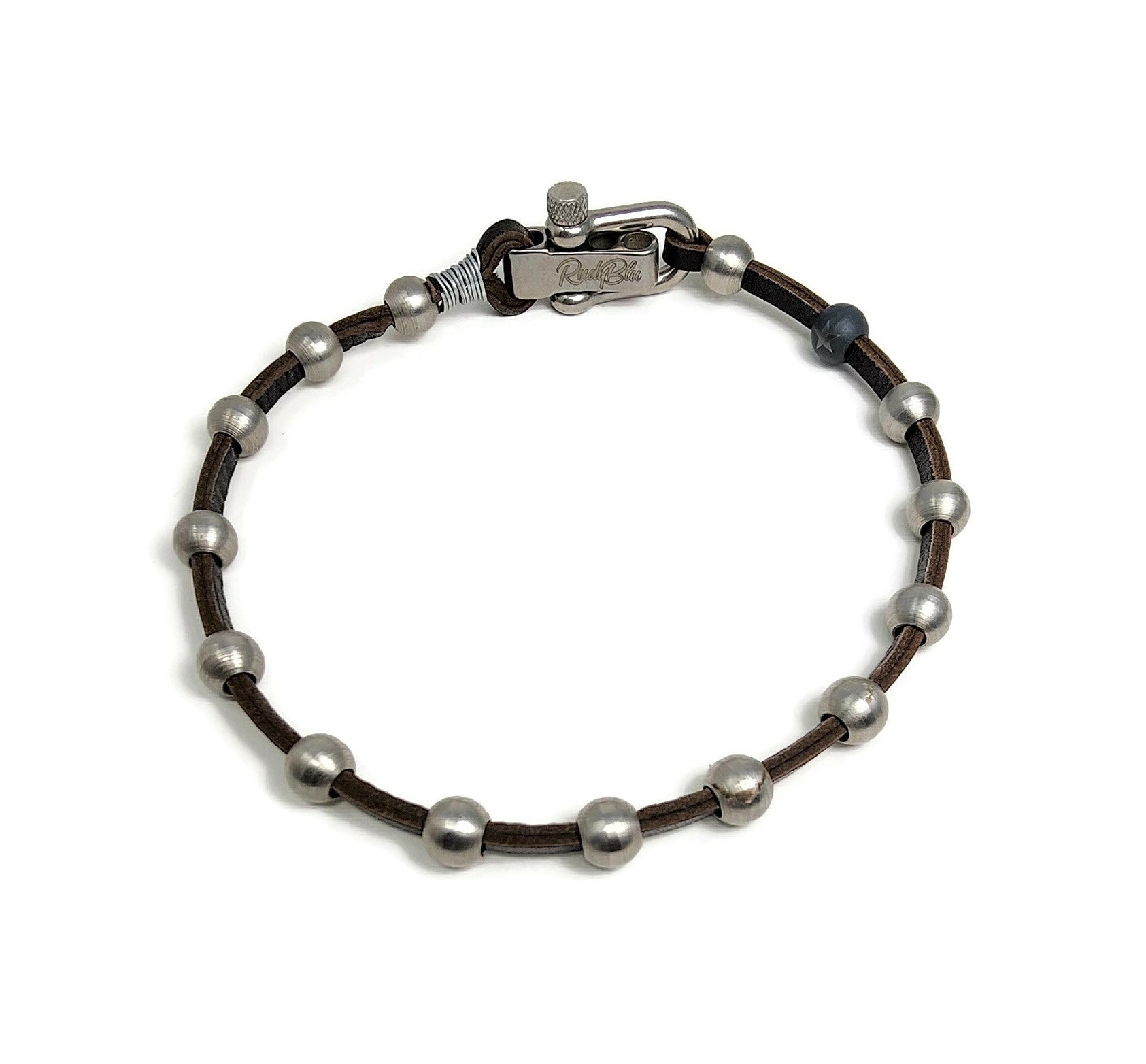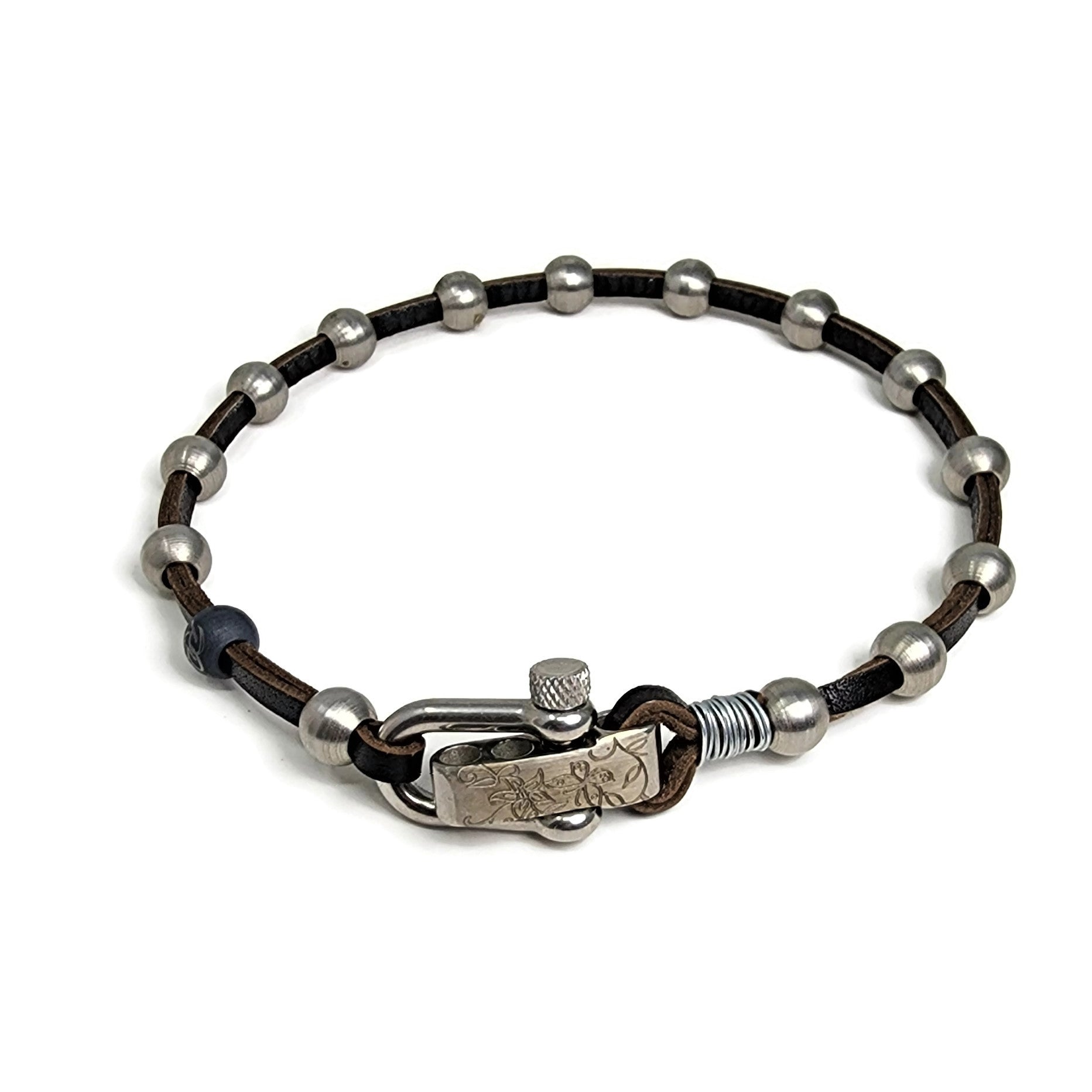 Our signature lathe turned stainless steel beads are fed on to beautiful brown leather and finished with a stainless steel U-Shackle buckle.