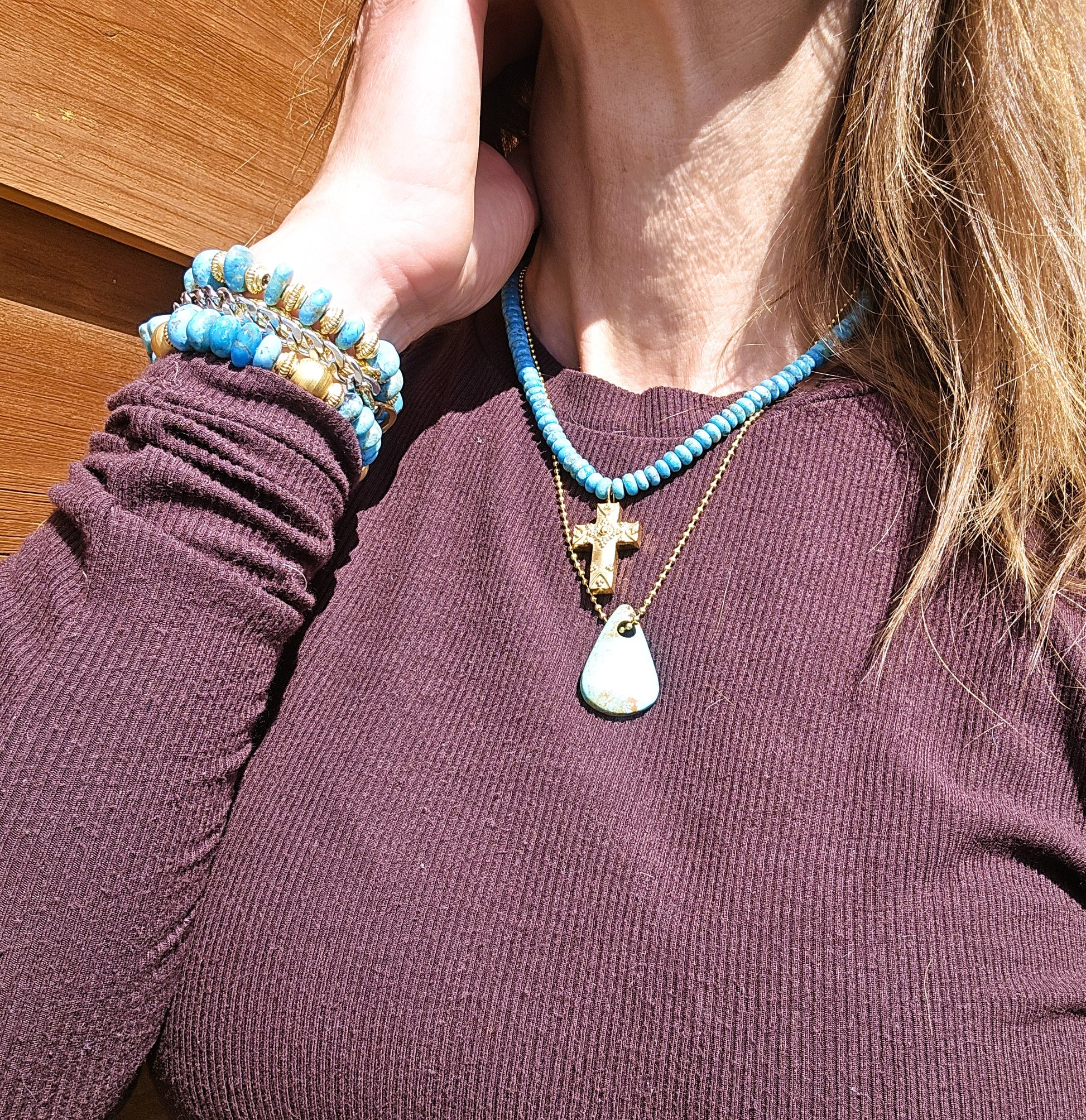 The hand-crafted gold cross pendant adds a touch of elegance, while the Kingman turquoise beaded necklace brings a pop of color.