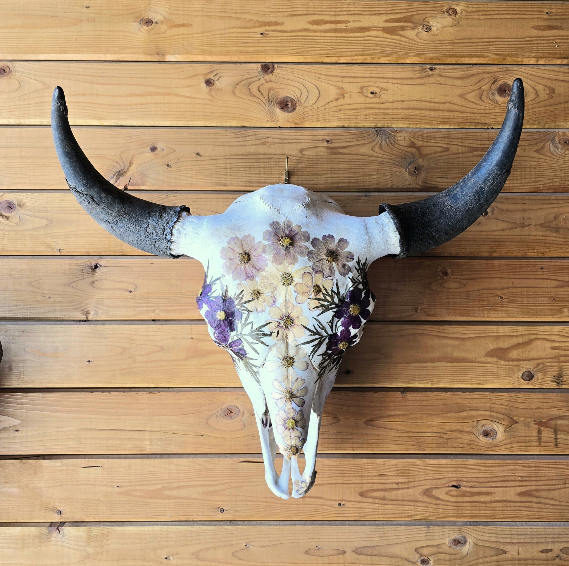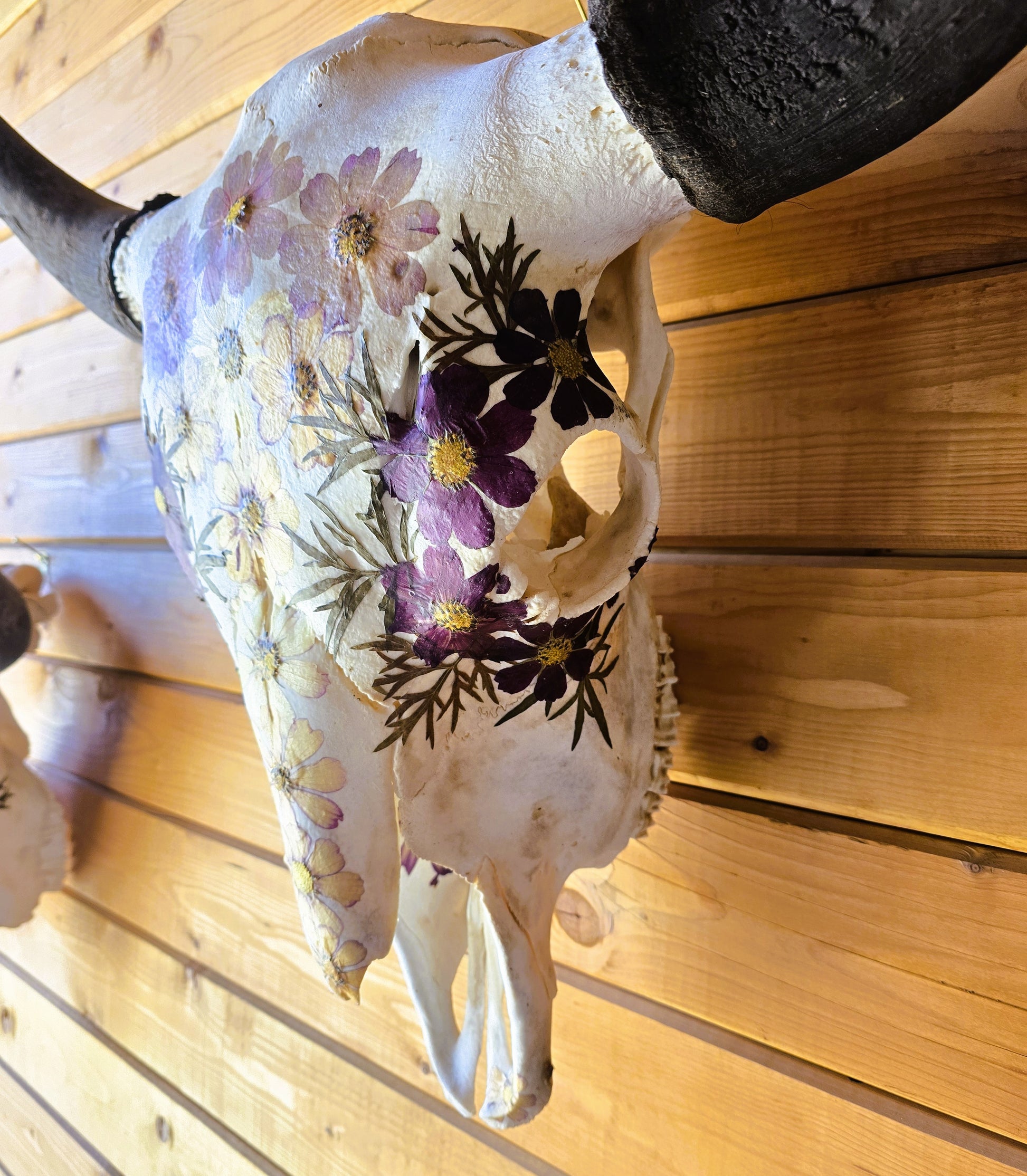 Marin is a beautiful bison skull made with pressed and dried Cosmos flowers and fern leaves.