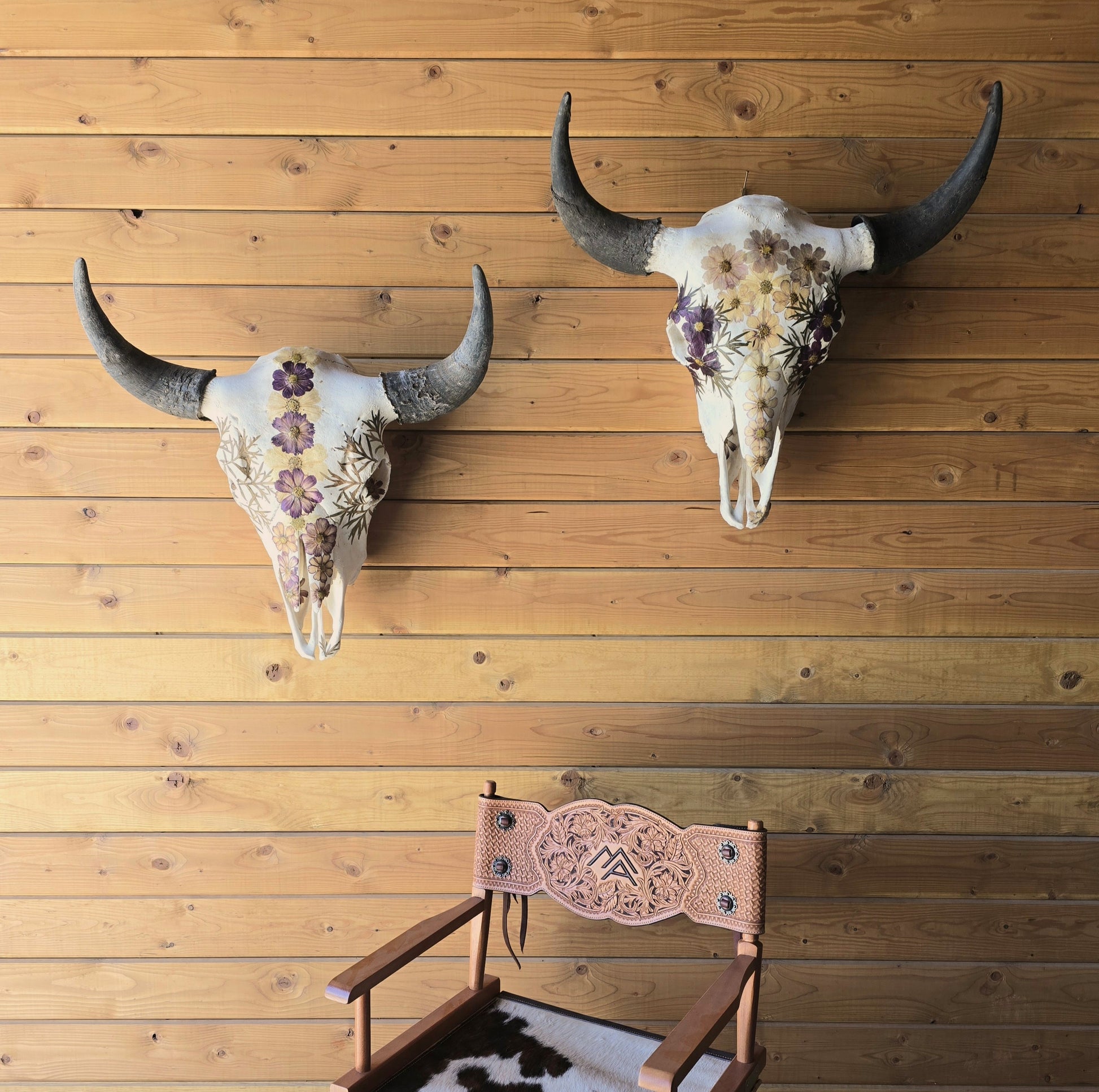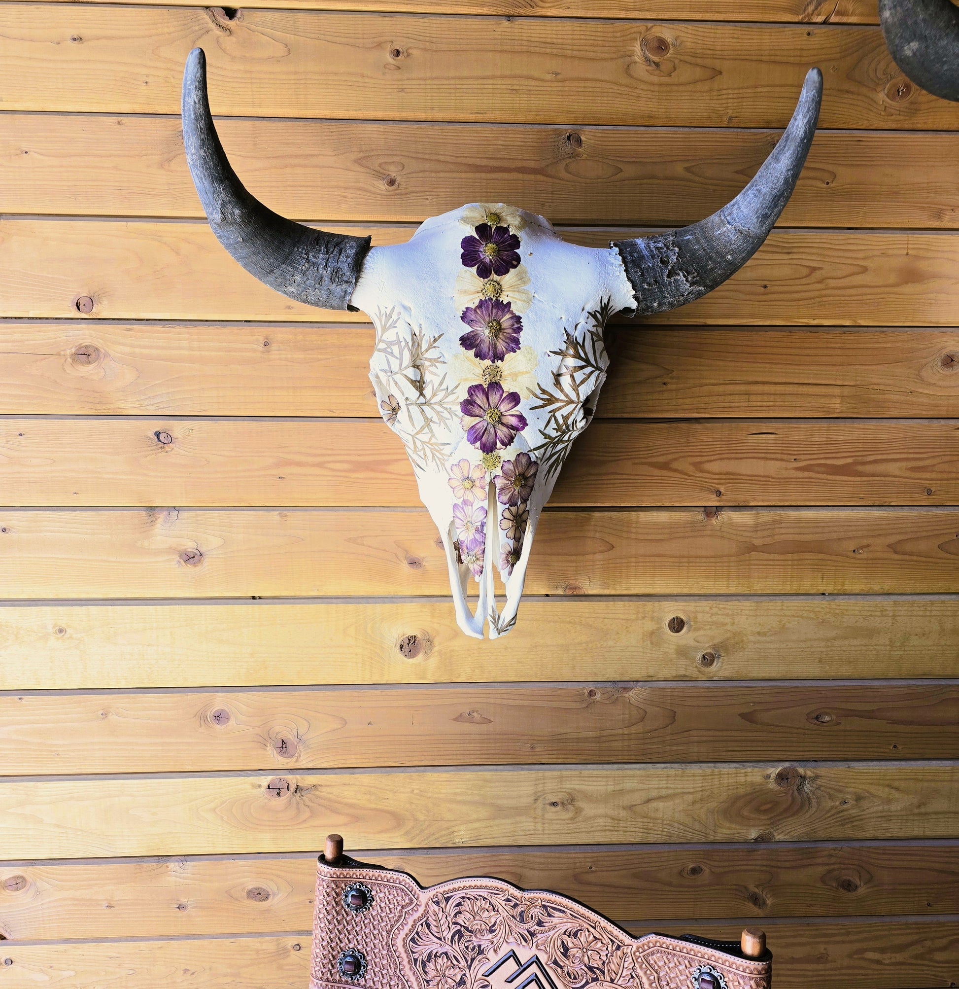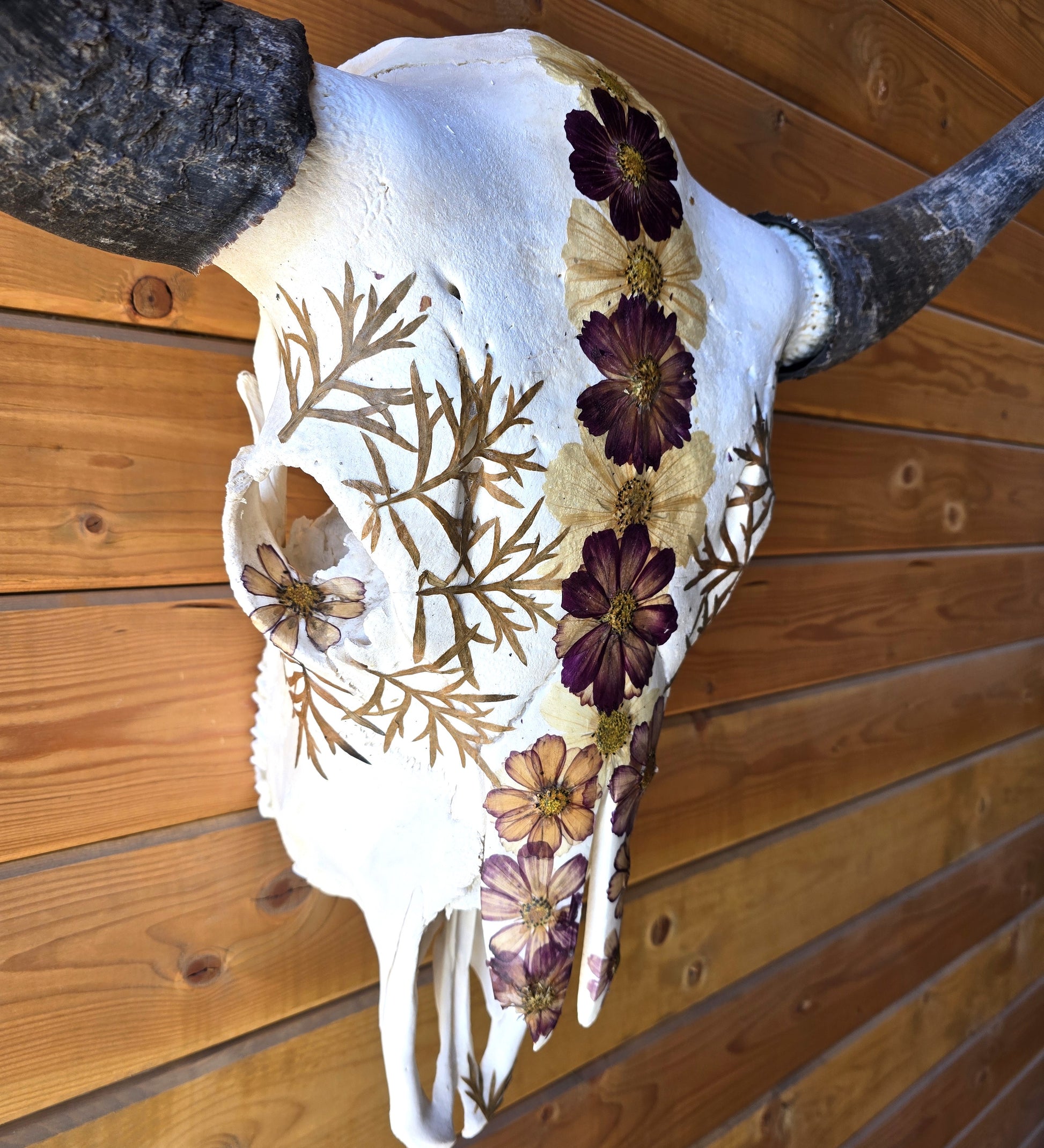 Phoenix is a beautiful bison skull made with pressed and dried Cosmos flowers and fern leaves.