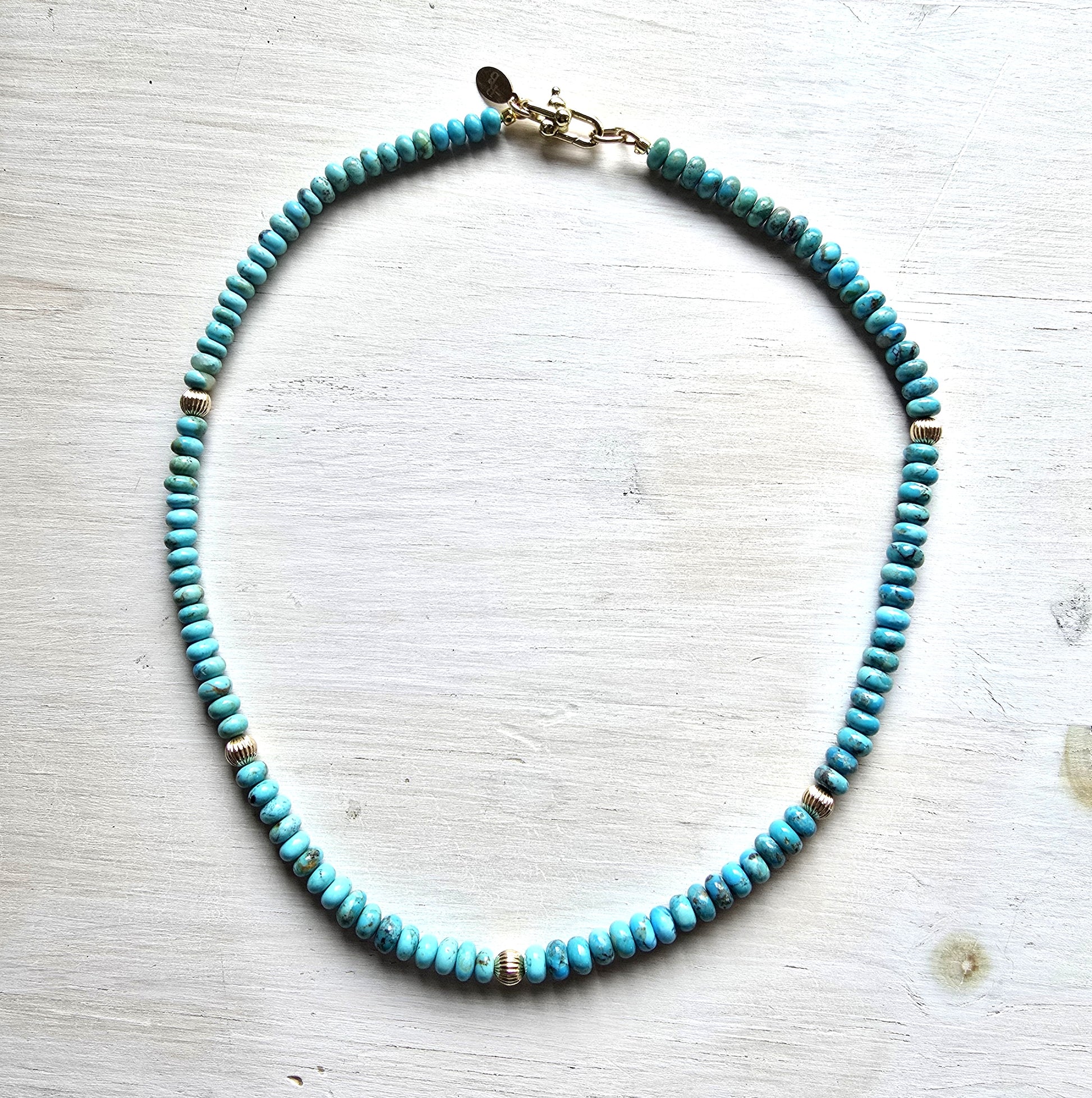 This 20" beauty strings together delicate rondelle Kingman turquoise beads punctuated with pops of gold accents. Layer it with your favorite pieces for a fun, personalized look that transitions effortlessly from casual coffee dates to night-out adventures.