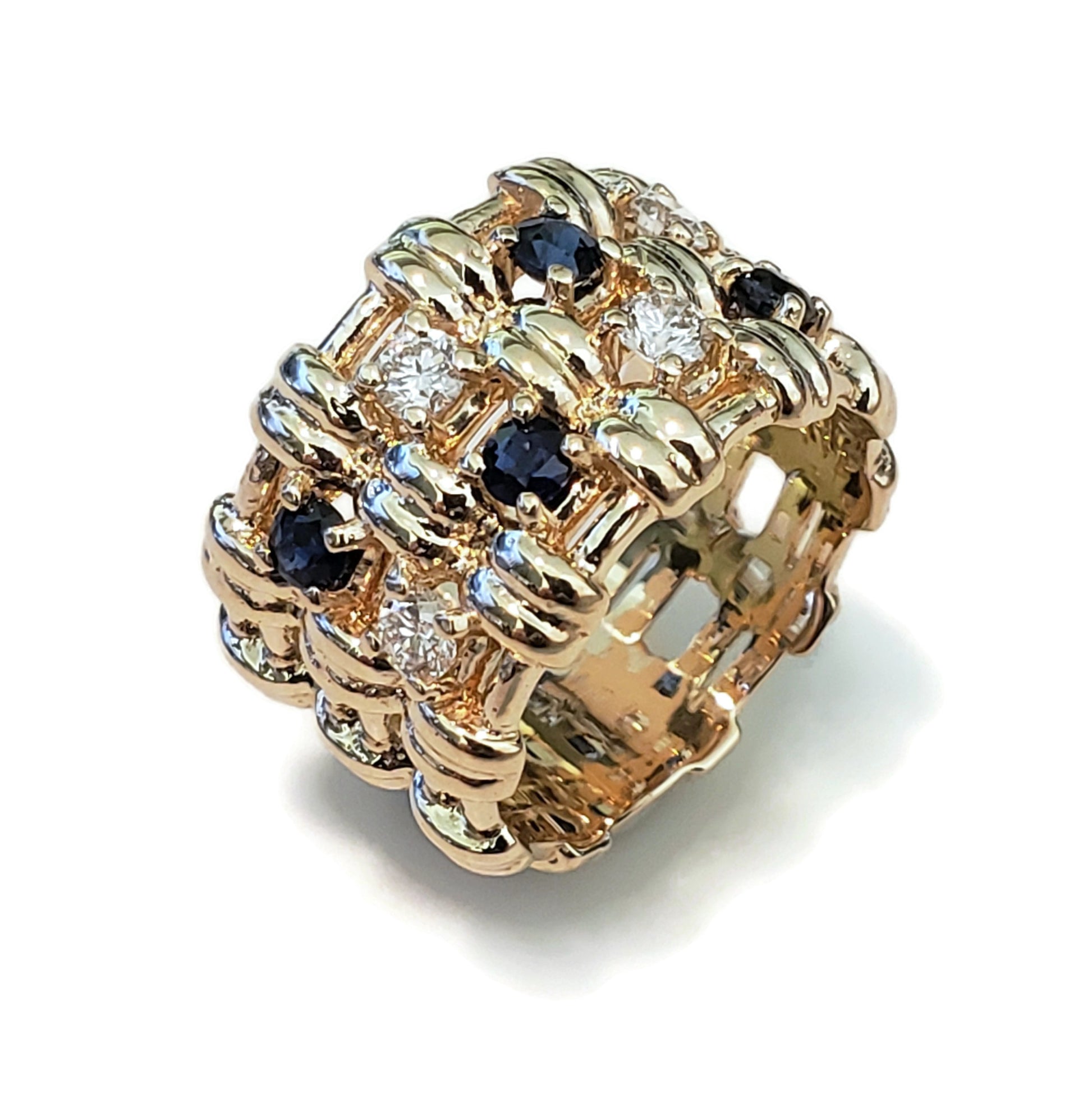 Woven wide band with diamonds and sapphires.