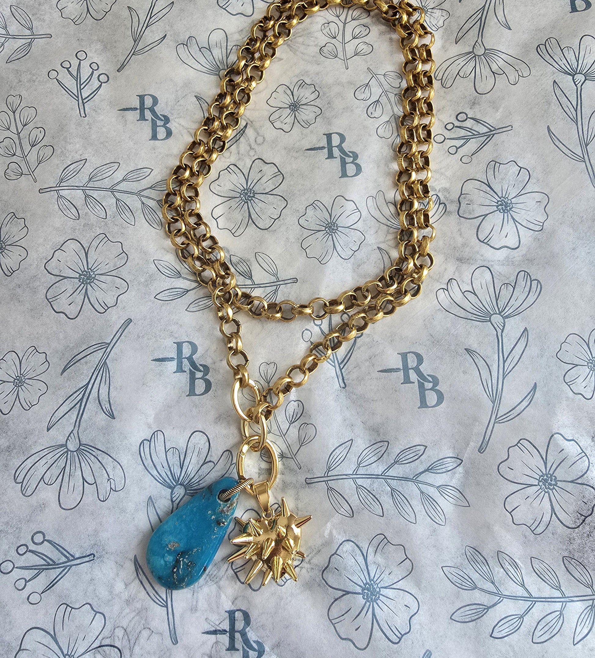 Featuring a striking 38" gold chunky rolo chain, this necklace showcases a large Kingman turquoise teardrop pendant paired with a gold spiked heart charm.