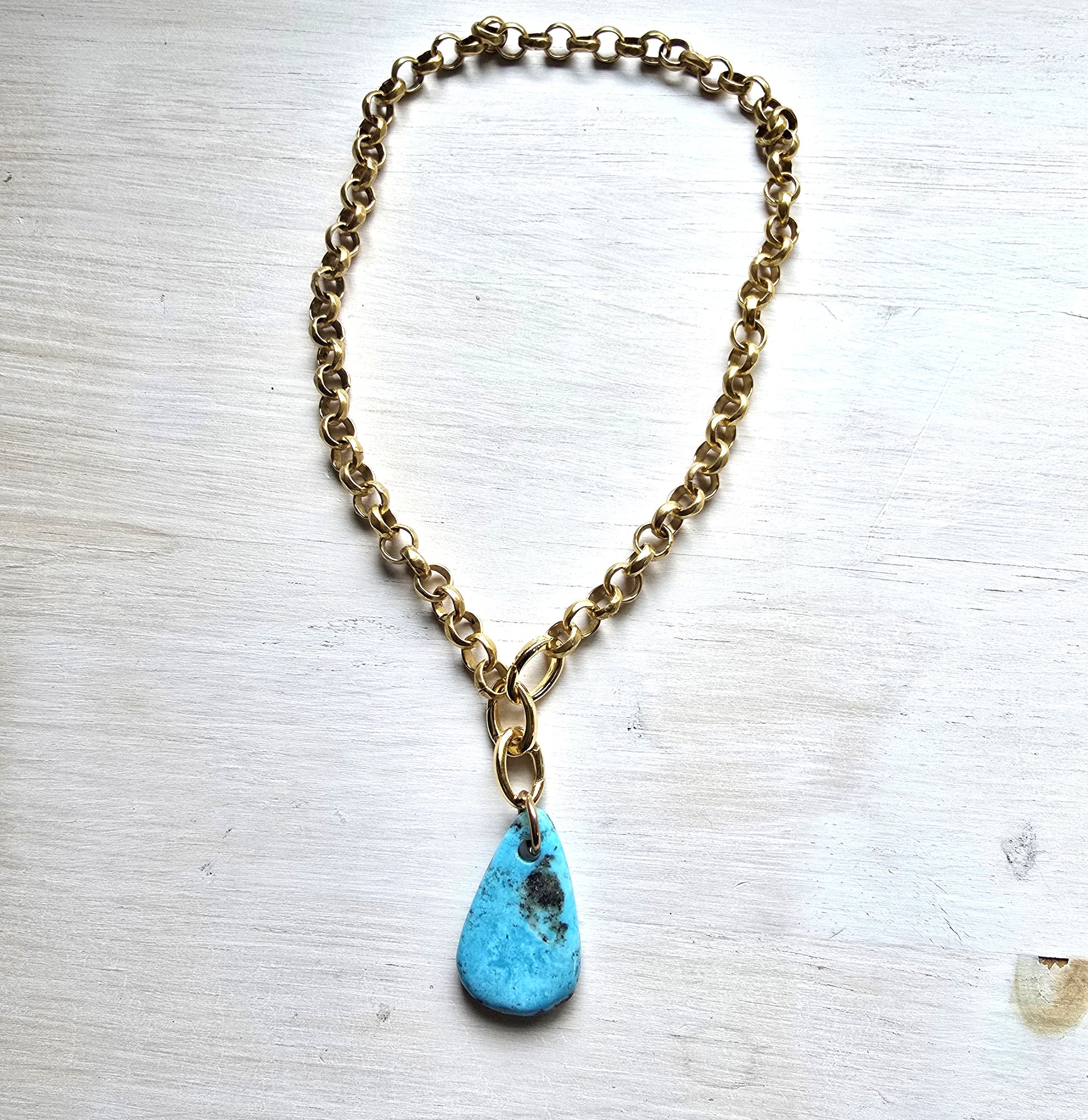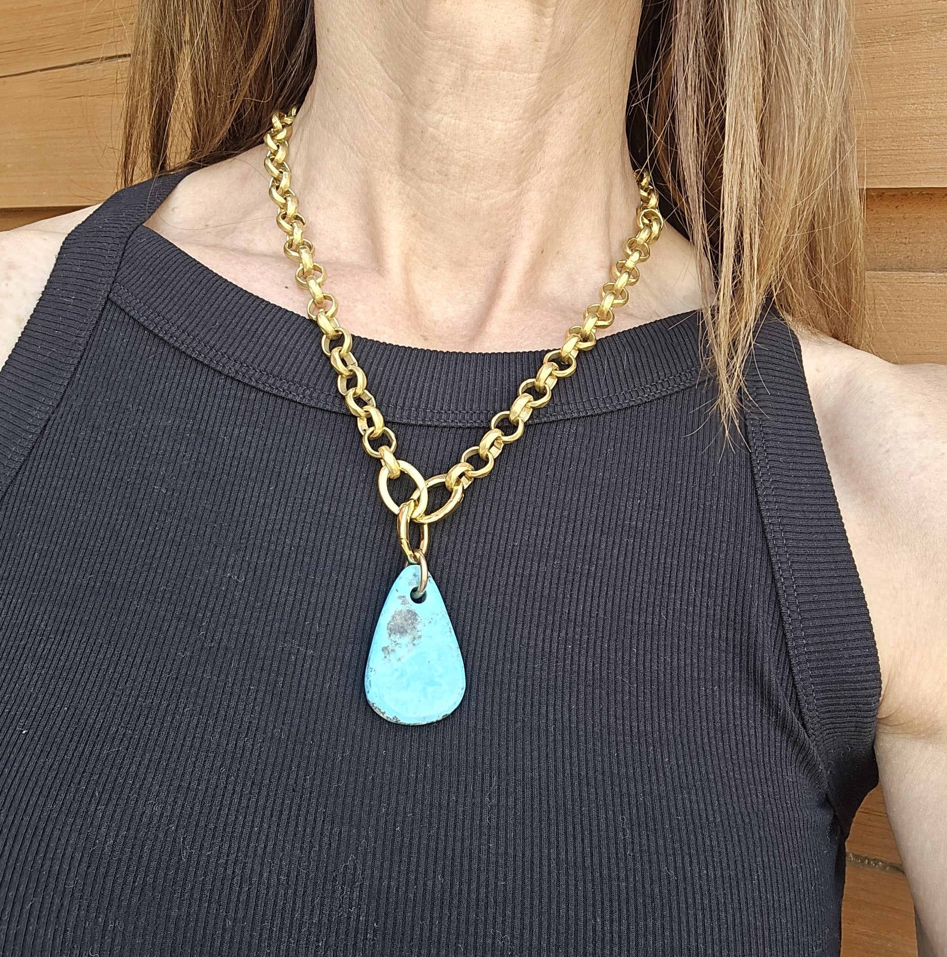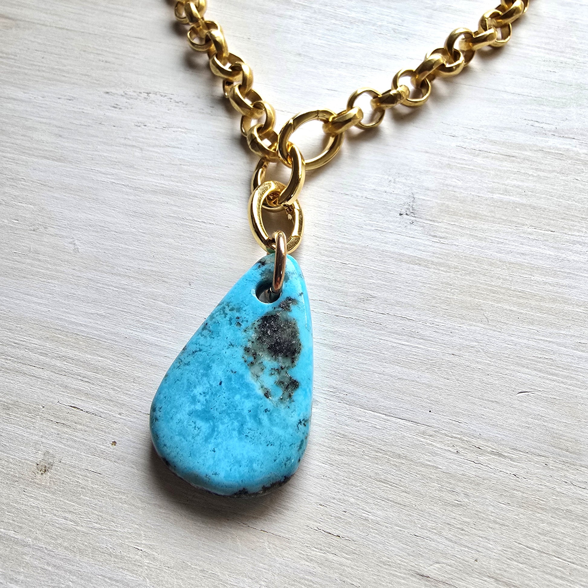 Large Kingman turquoise tear drop pendant on a hammered gold Rollo chain necklace.